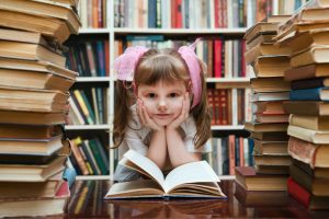 preschooler little girl reading a book in the library