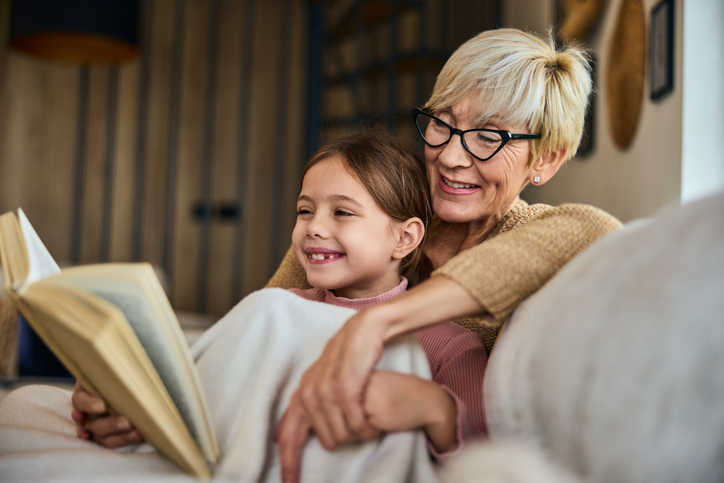 Smiling grandma and her grandchild reading a book at home while sitting on the couch, covered in a blanket.